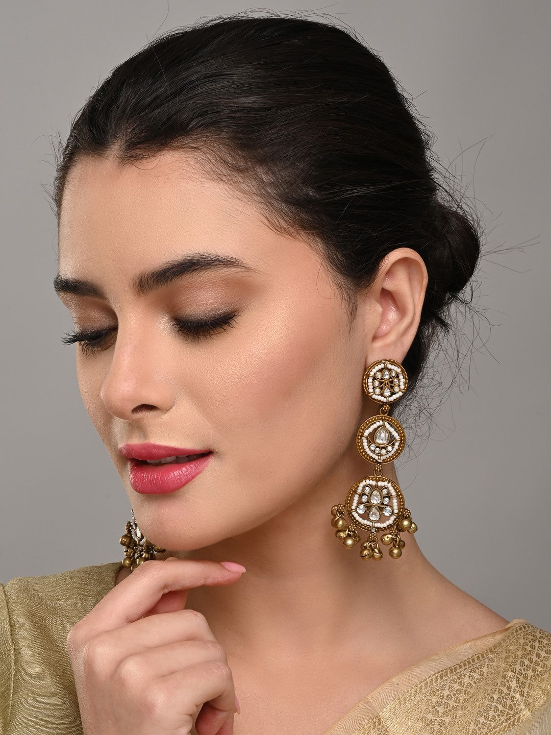 Add a touch of vintage elegance to your style with these antique gold-finish drop earrings. Crafted from high-quality brass, they feature dazzling AD stones and playful Ghungroo drops for a perfect blend of traditional charm and contemporary allure. Designed with a secure post-and-back closure, these earrings are both comfortable and stylish, making them ideal for festive occasions, weddings, or special evenings. Elevate your jewelry collection with these timeless treasures.