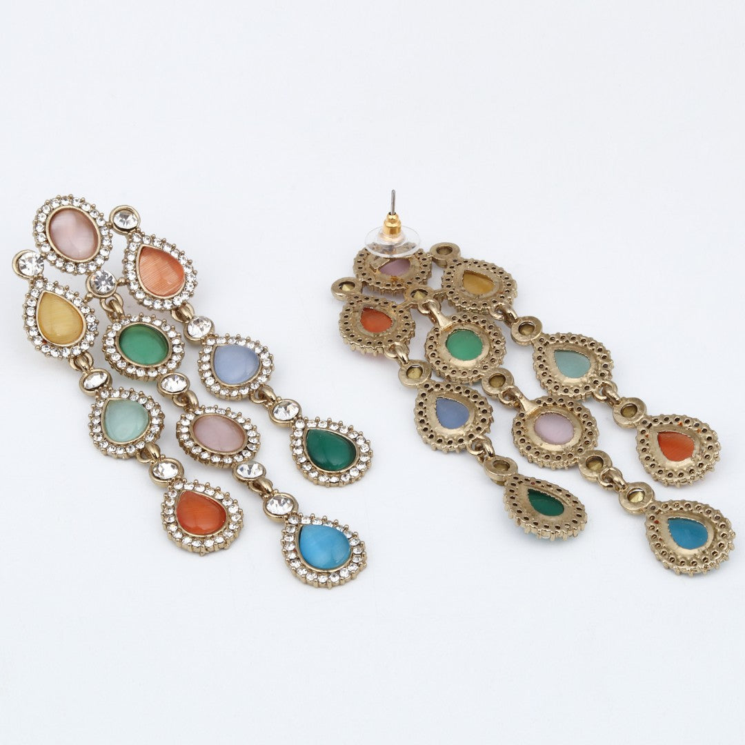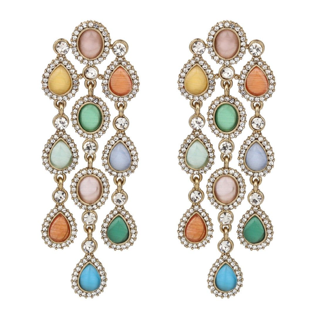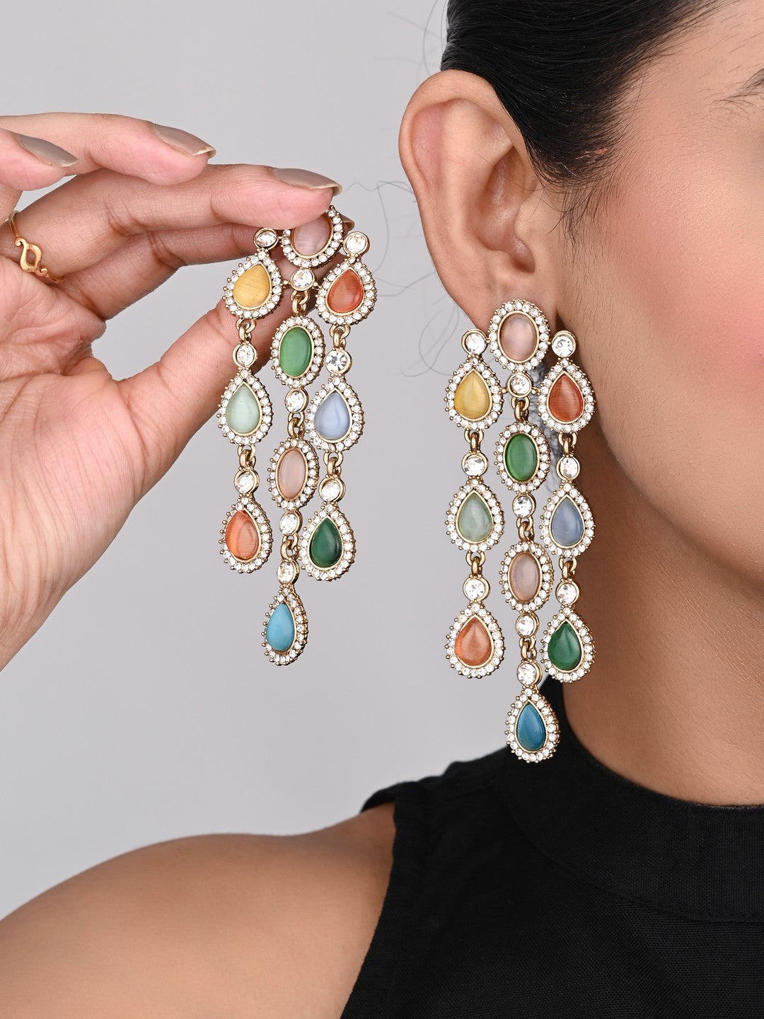 Elevate your look with these stunning chandelier drop earrings, crafted from high-quality zinc alloy and finished with a radiant gold plating. Embellished with dazzling glass stones, these earrings offer the perfect blend of elegance and glamour. Designed with a secure post & back closure, they ensure a comfortable fit for all-day wear.