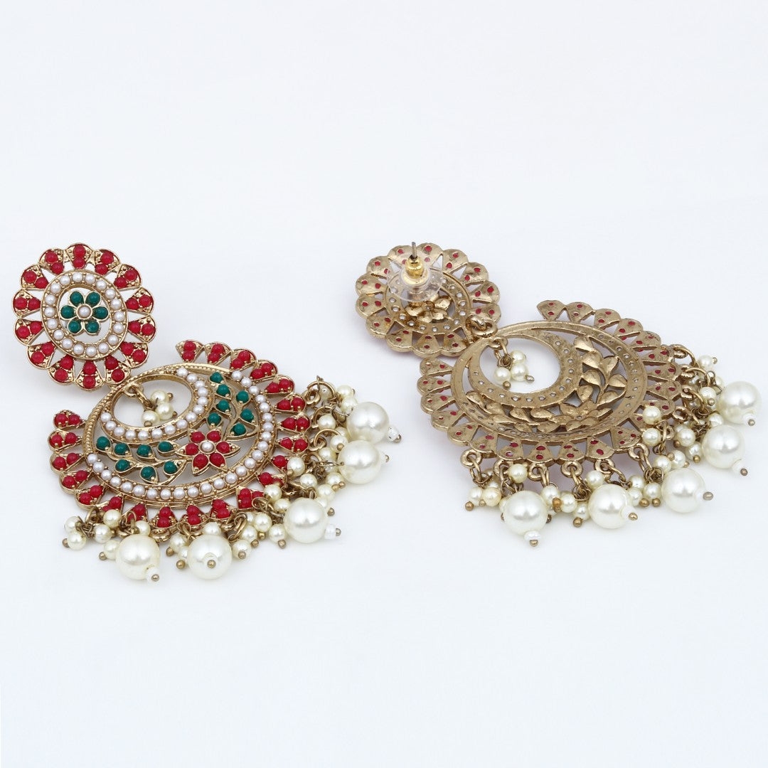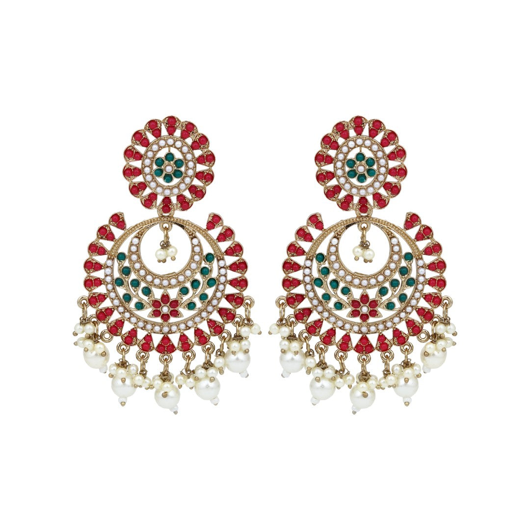 Gold-plated Circular Chandbali earrings feature a unique fusion of traditional crescent moon designs with a round frame,...