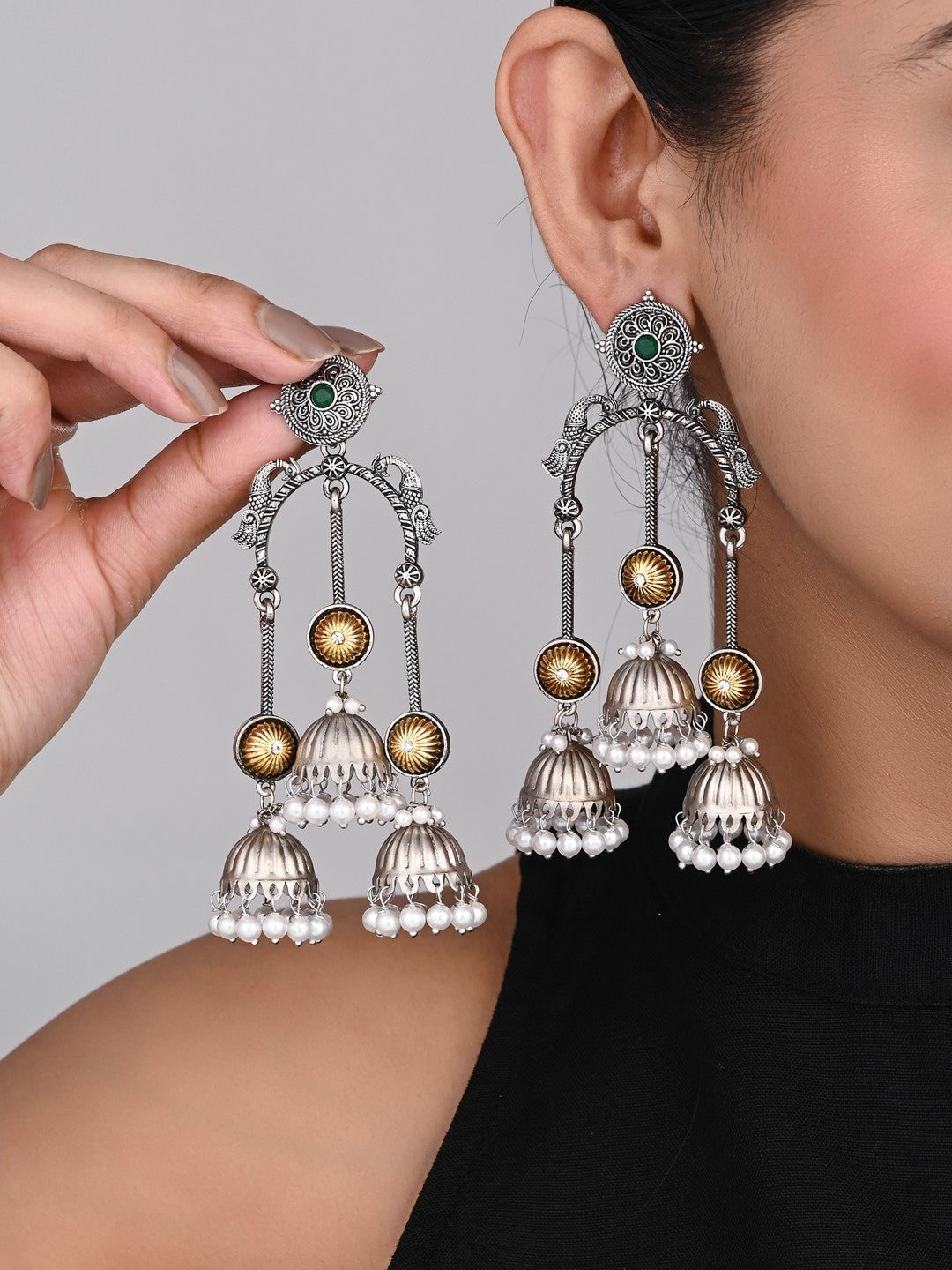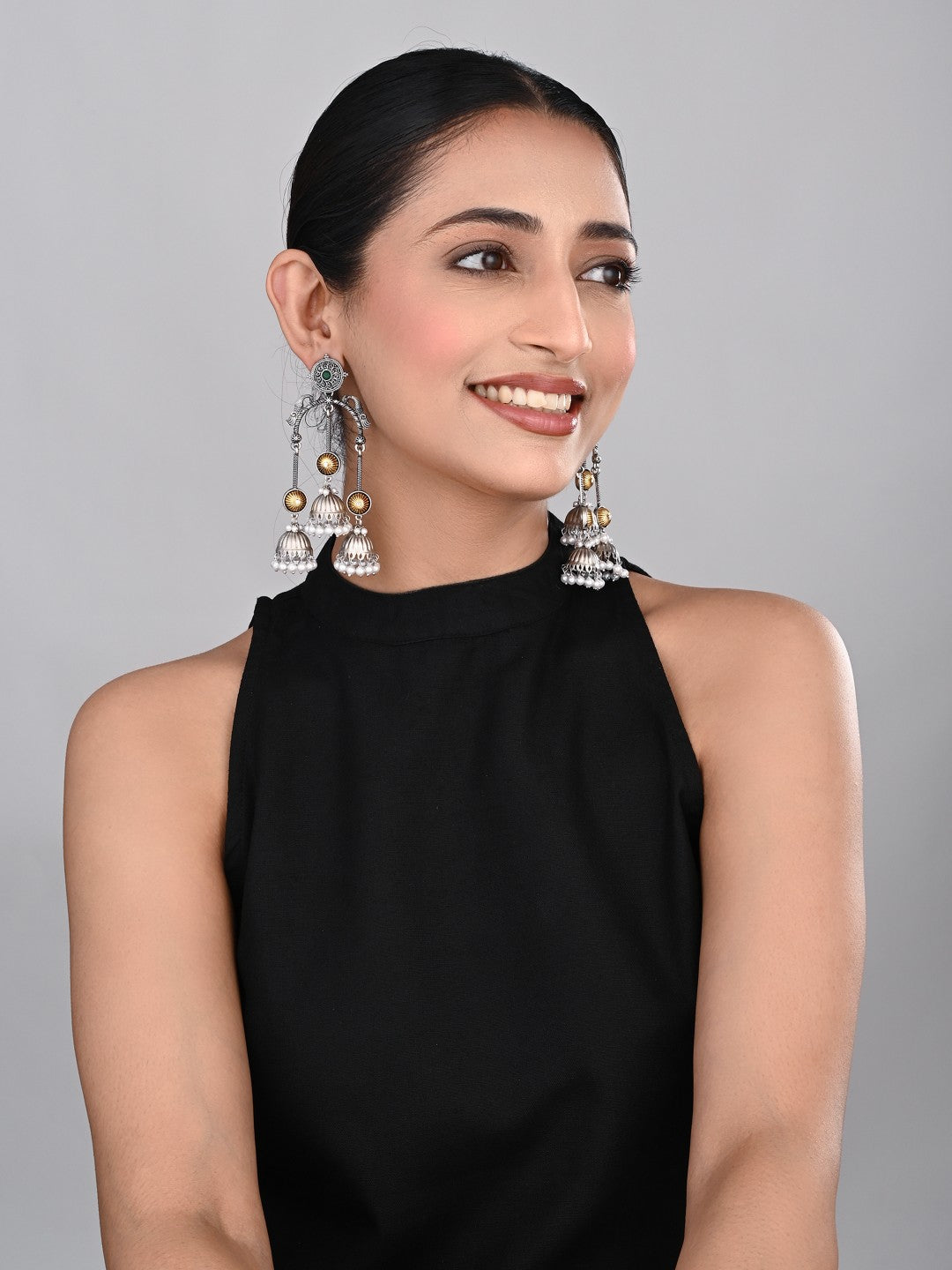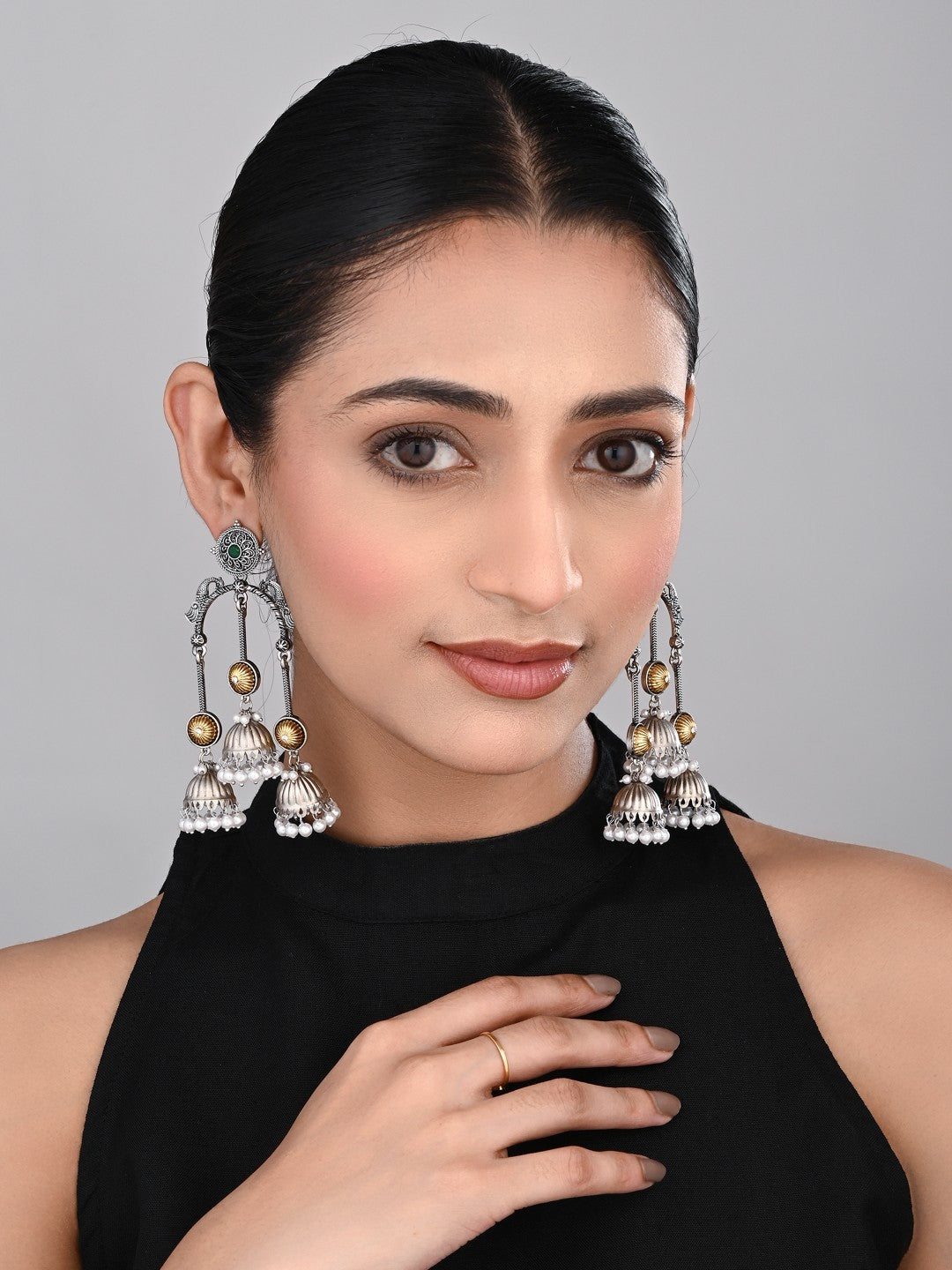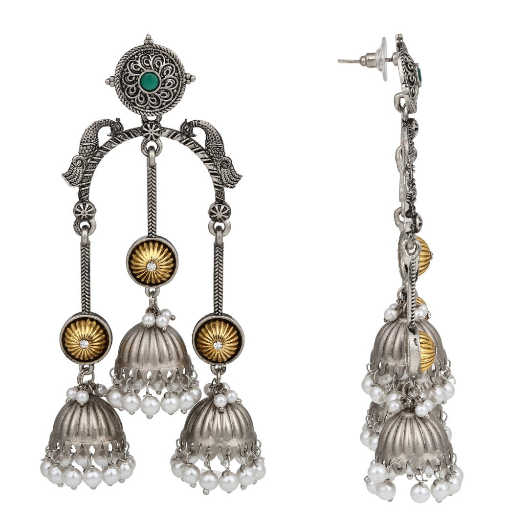 Grace your look with these elegant silver-plated long jhumka earrings, designed to be lightweight for all-day comfort. Crafted from durable metal alloy, they feature delicate artificial pearl drops that add a touch of timeless charm. Perfect for festive occasions, weddings, or traditional attire.