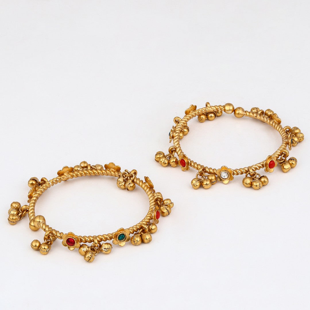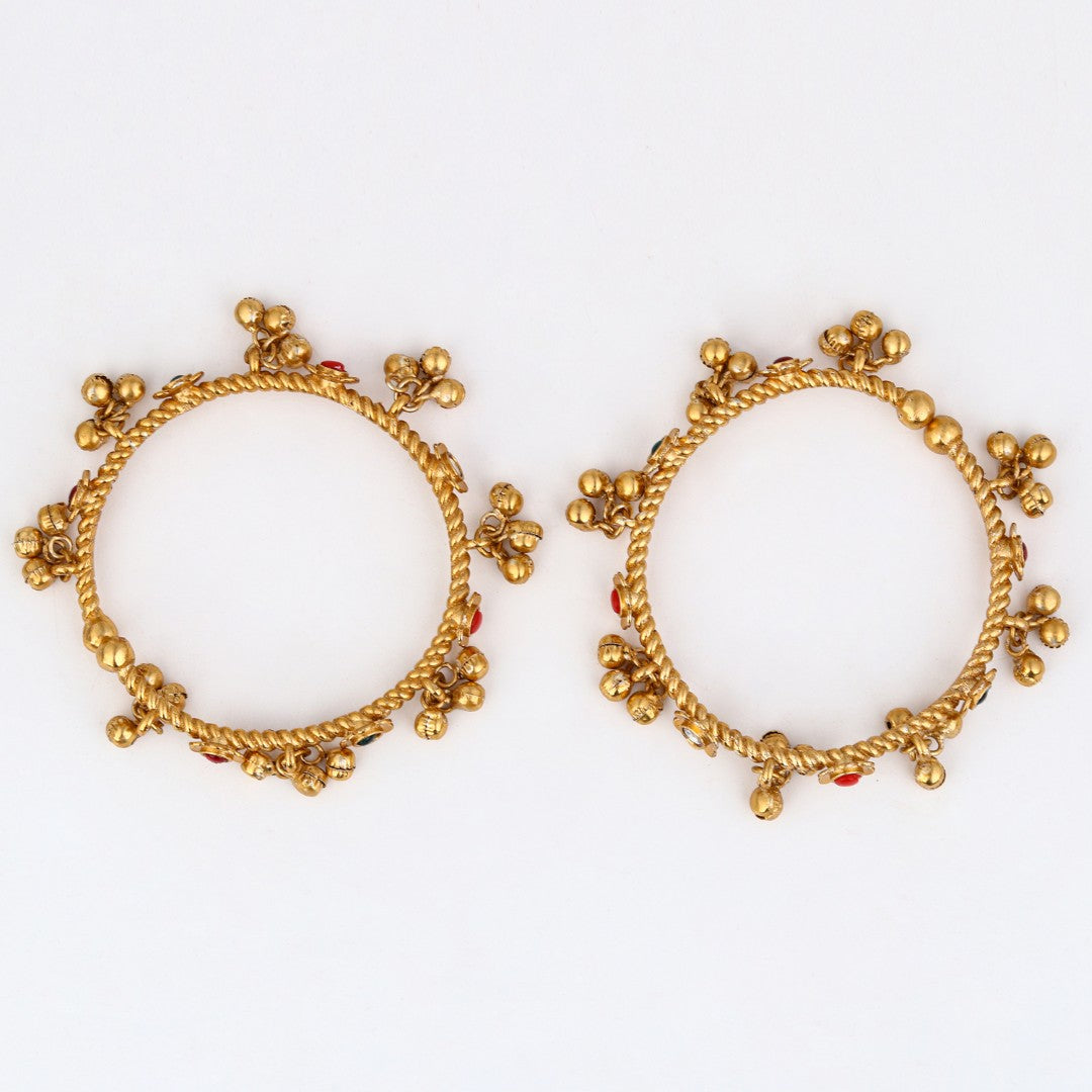 Elevate your ethnic look with these stunning gold-toned ghungroo bangles, featuring cascading tiny bells for a melodic jingle with every move. Adorned with vibrant red beads, the sturdy brass alloy hoops offer everyday comfort and shine, perfect for festivals, dances, or casual wear. Ideal for pairing with traditional outfits, these non-adjustable pieces blend timeless Indian craftsmanship with modern appeal