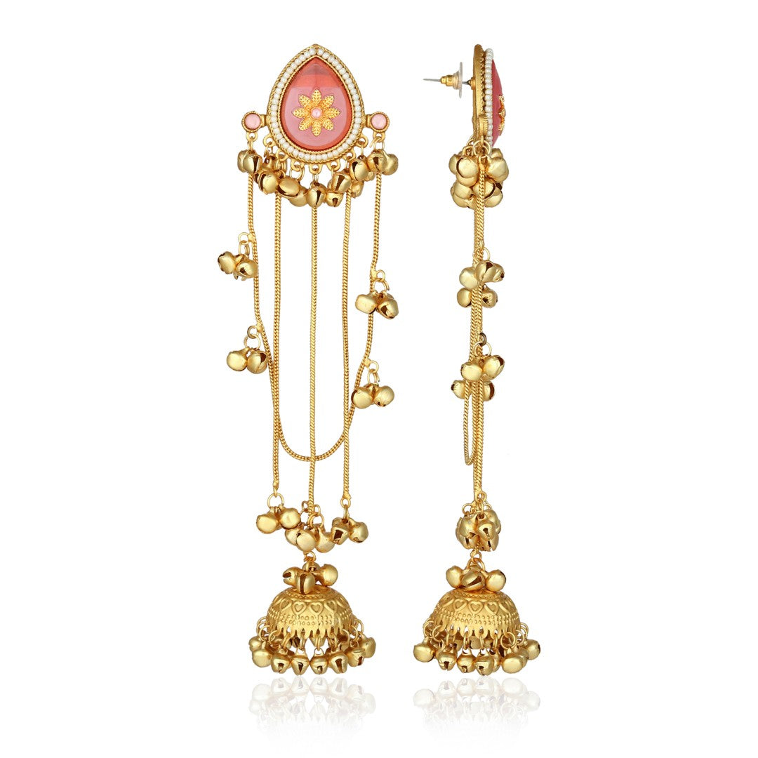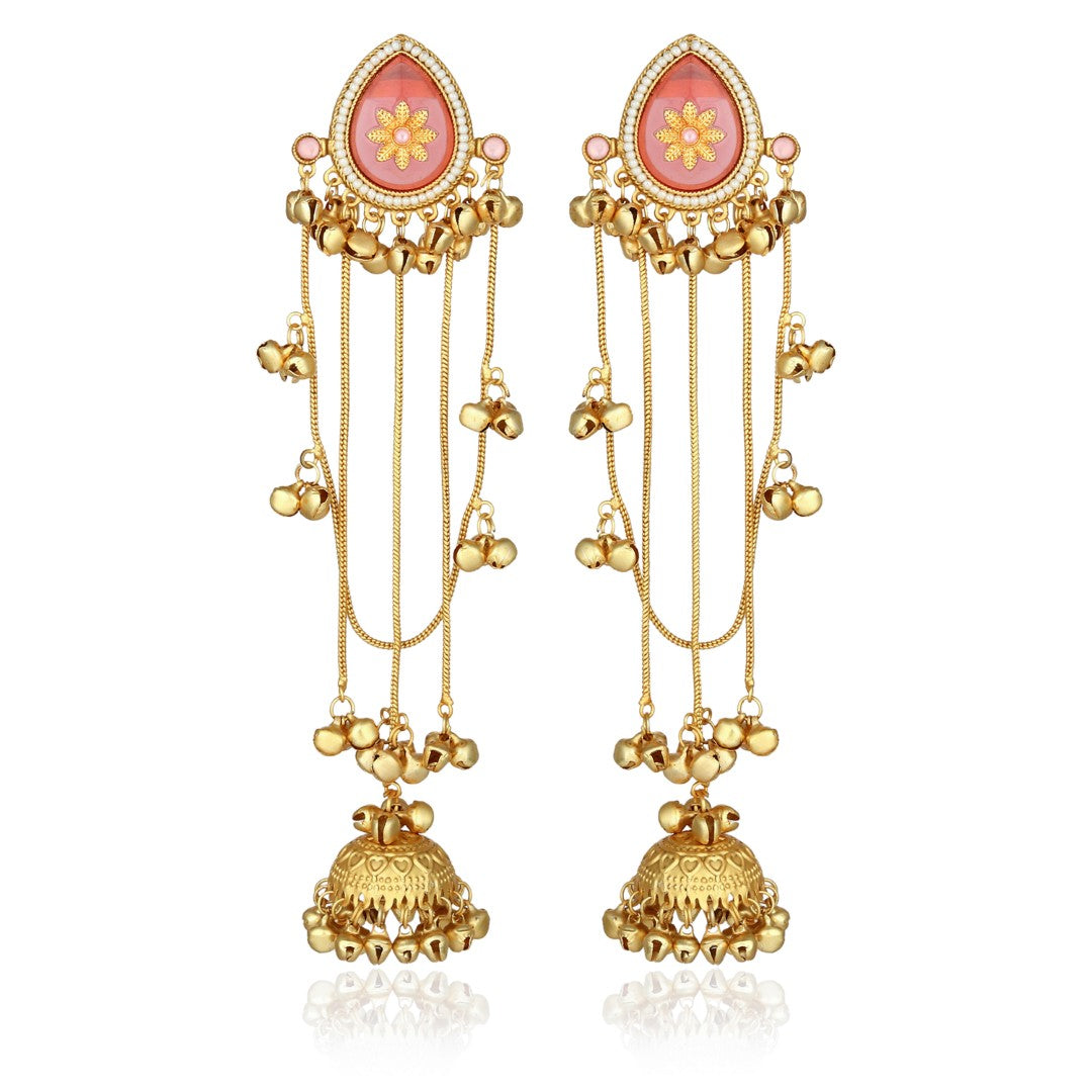 Elevate your ethnic look with these antique gold jhumka earrings featuring rich green meenakari detailing and cascading chain accents. Finished with beautifully crafted dome-shaped jhumkas, this pair offers graceful movement and timeless charm—perfect for weddings, festive celebrations, and traditional attire. ✨