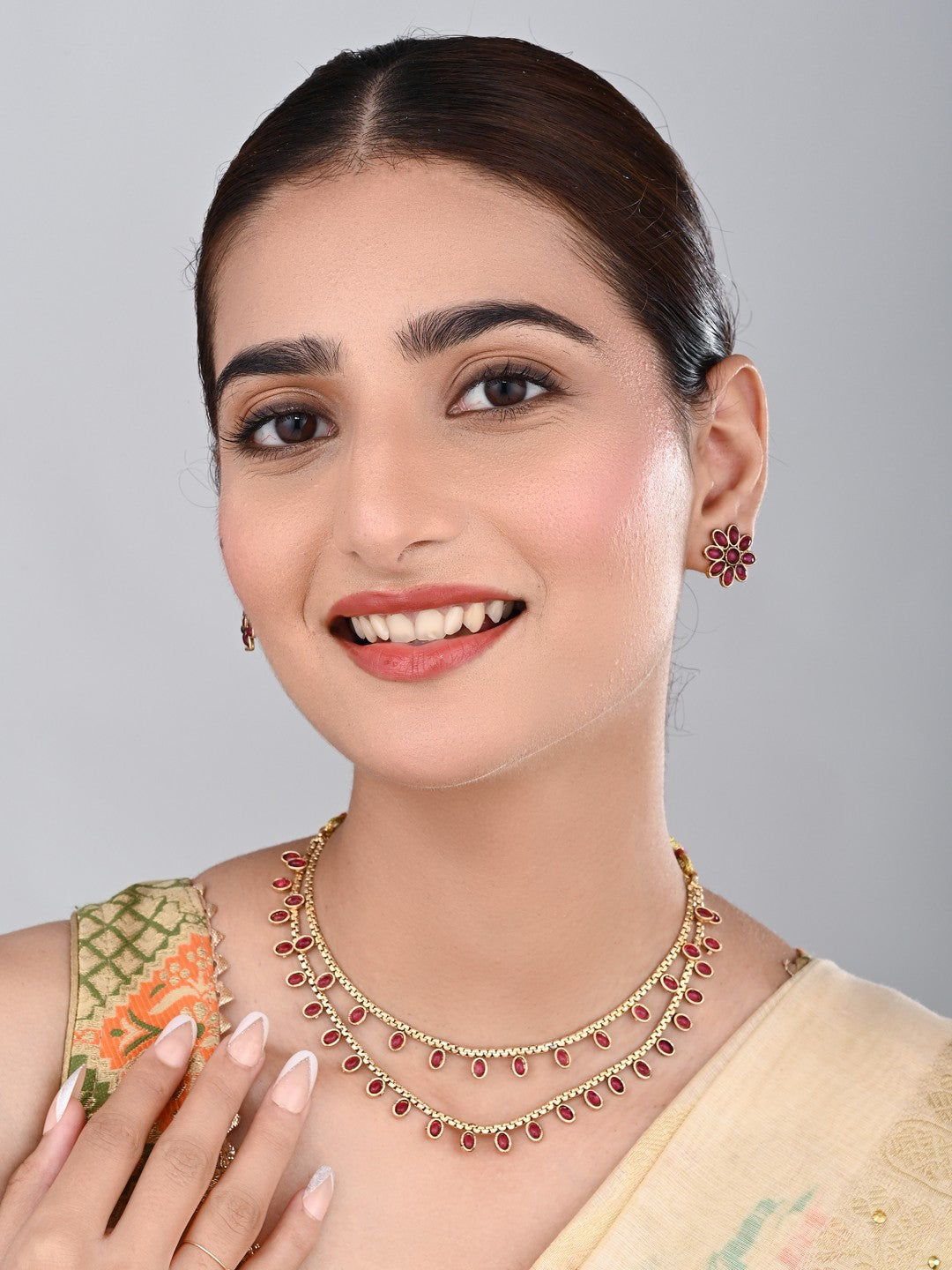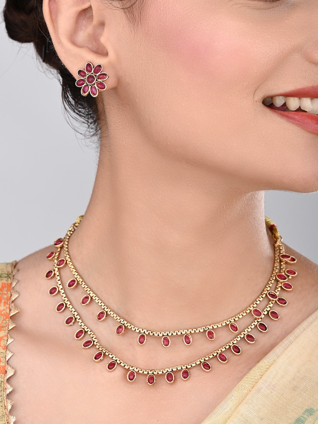 This gold-plated double layered necklace set features intricate craftsmanship, elegantly adorned with delicate red stones that add...