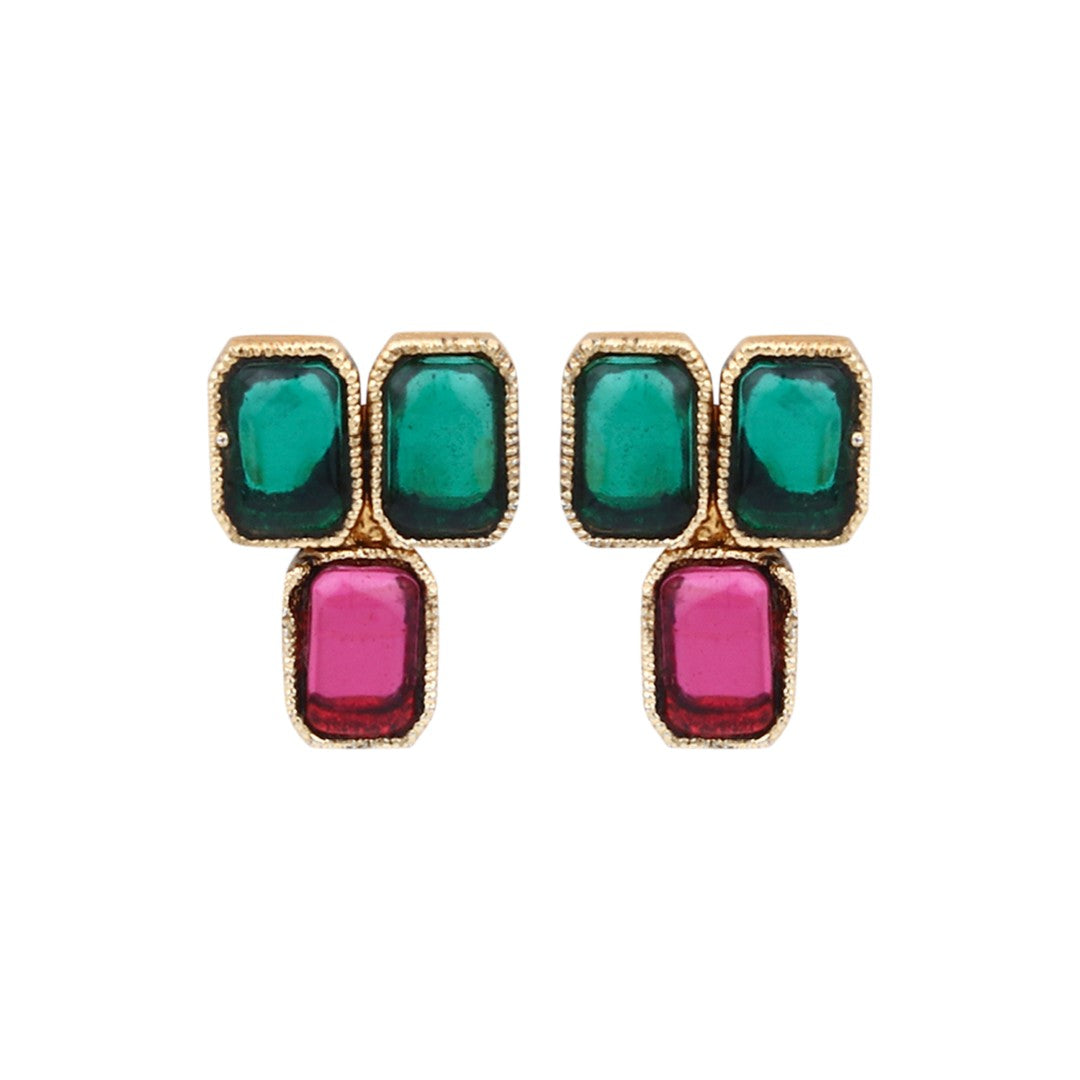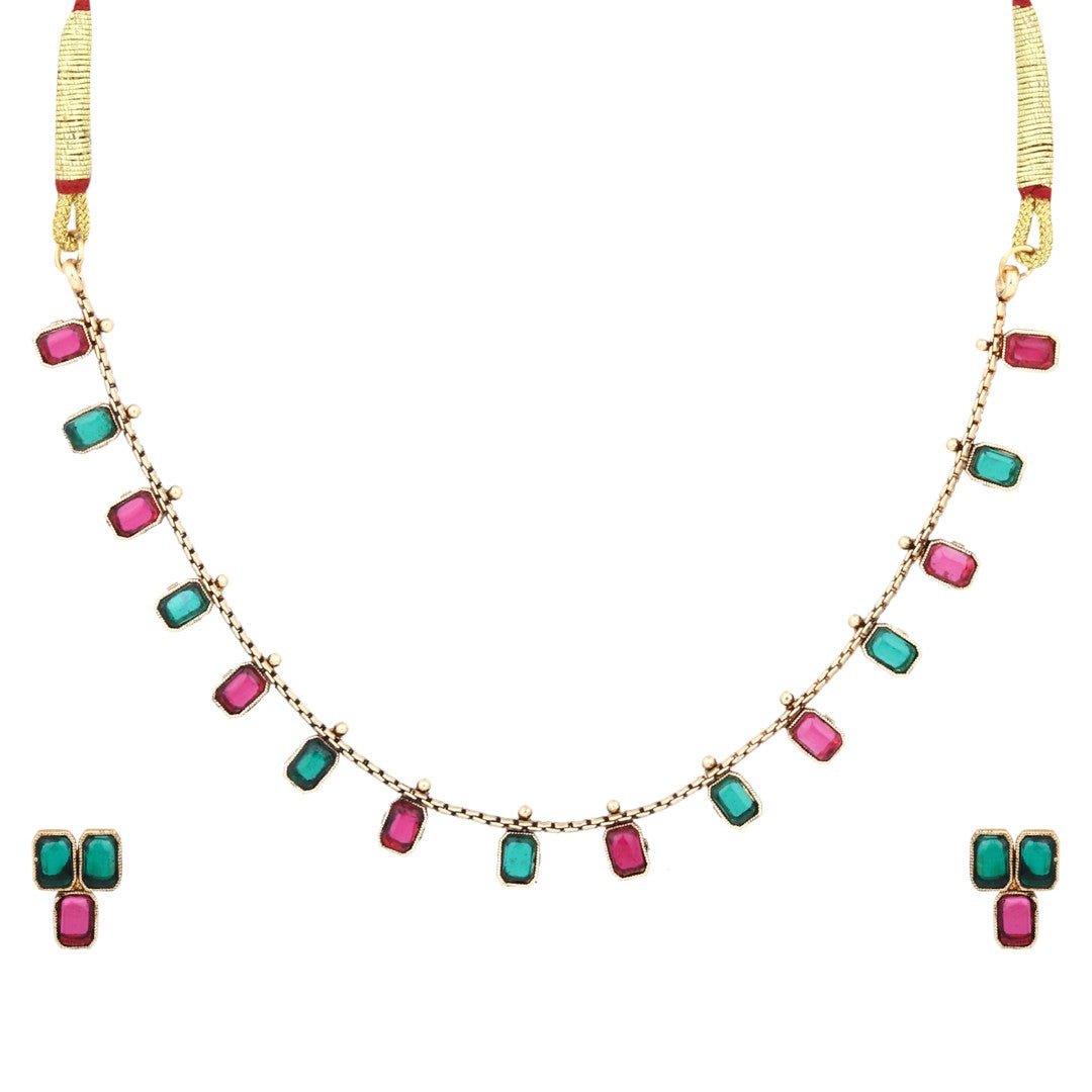 This gold-plated double layered necklace set features intricate craftsmanship, elegantly adorned with delicate red stones that add...