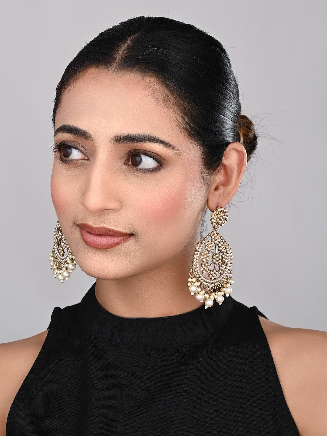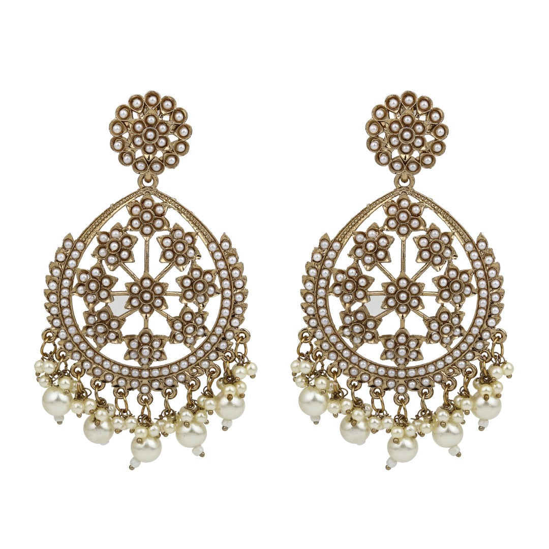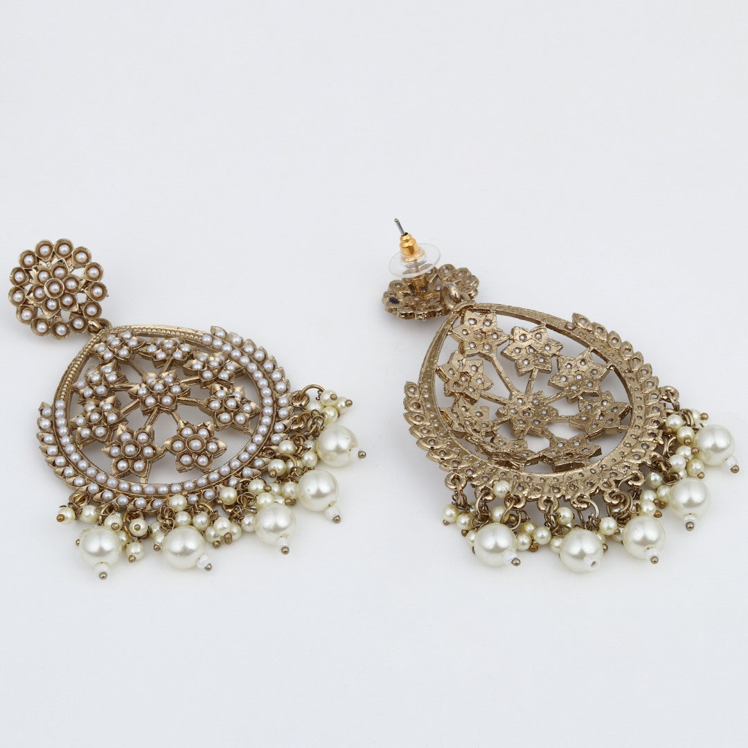 Embrace timeless elegance with these gold-plated floral motif earrings, perfect for festive events and celebrations. The design features a large teardrop-shaped frame adorned with intricate floral patterns and delicate pearl inlays. The top is embellished with a circular cluster of pearls, while cascading pearl and bead tassels at the bottom add movement and a luxurious touch. Lightweight and stunning, these earrings pair beautifully with traditional outfits like sarees and lehengas, making them an essential accessory for those seeking classic glamour with a modern twist.