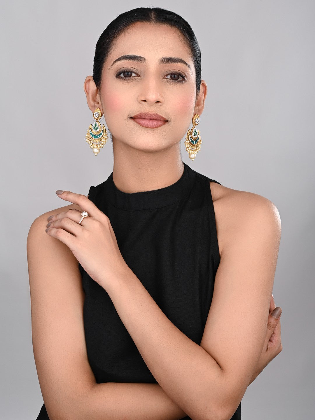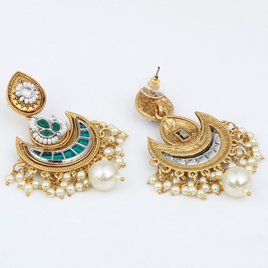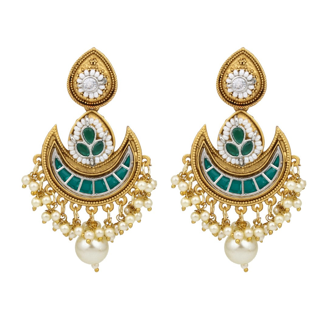 Make a stunning statement with these gold-plated crescent chandbali earrings, perfect for festive occasions and celebrations. The unique design combines an ornate teardrop-shaped stud embellished with pearls and a sparkling white stone, followed by an elegant crescent motif inlaid with vibrant green stones and accented by pearl borders. Delicate strings of small pearls and a signature large pearl drop create graceful movement and a touch of classic glamour. Lightweight and versatile, these earrings are ideal for pairing with sarees, lehengas, or fusion wear, making them a must-have for lovers of traditional and contemporary jewelry alike