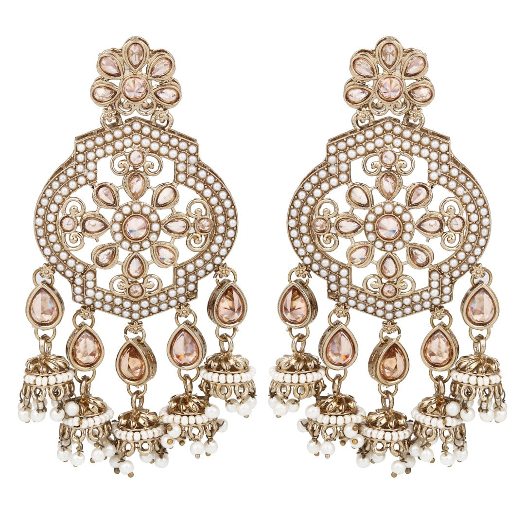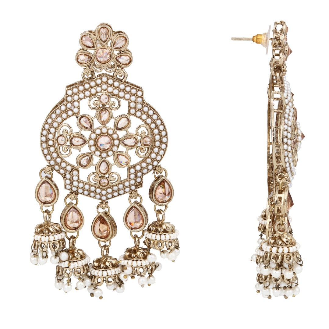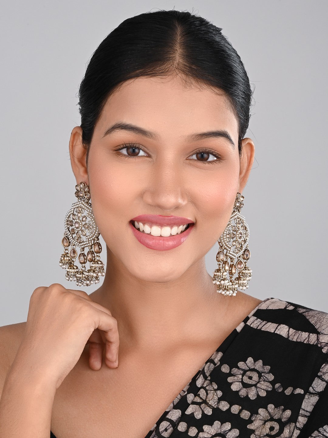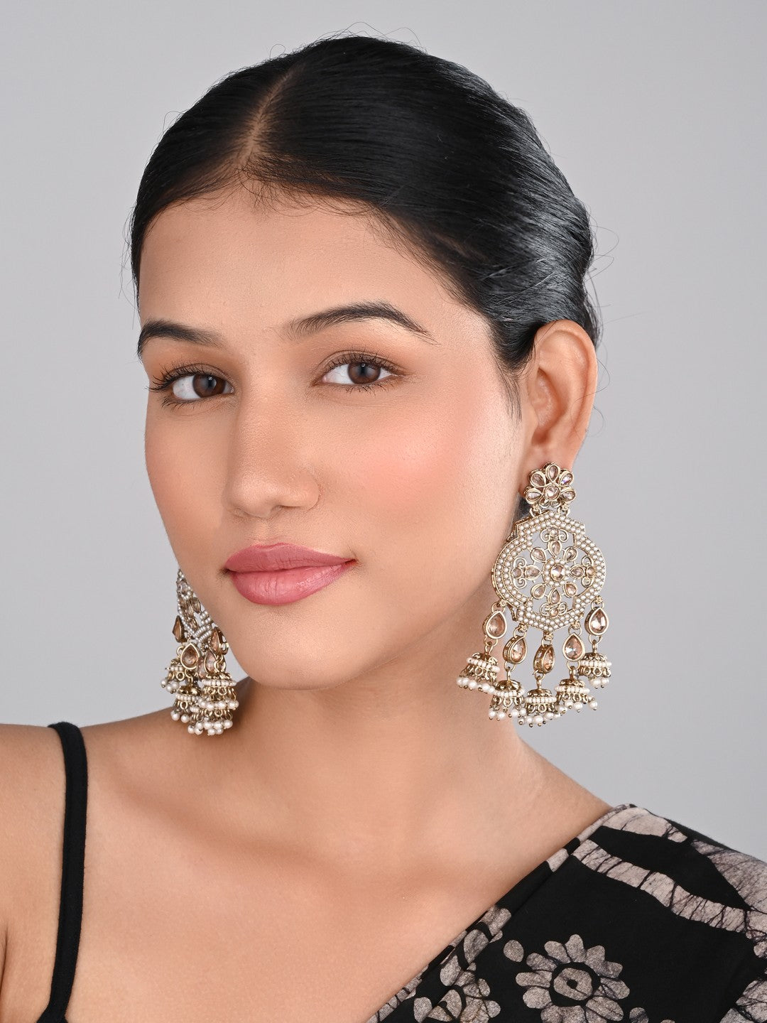 Gold plated Chandbali earrings, crafted from metal alloy and detailed with Kundan stones and bead drops, are...