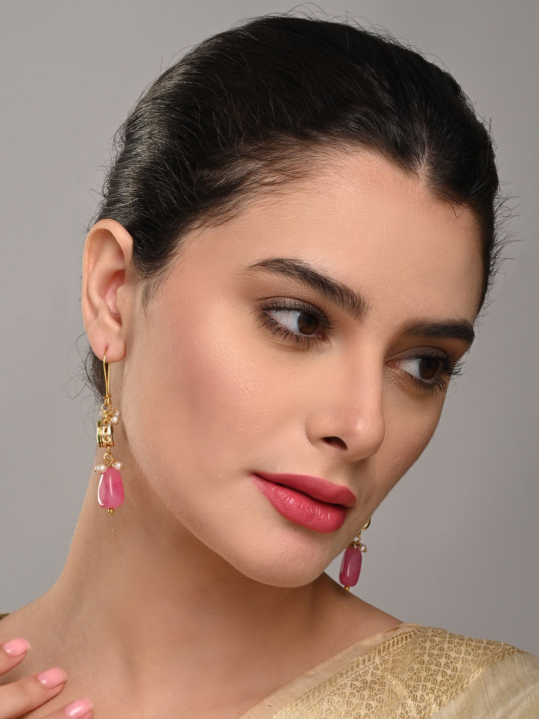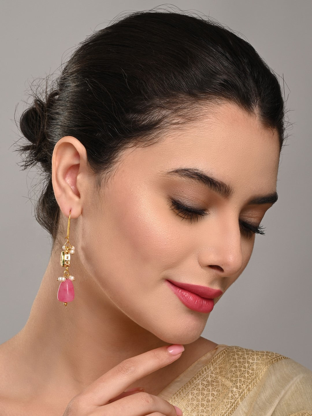 Gold-Plated Kundan & Natural Pink Stone Drop Earrings