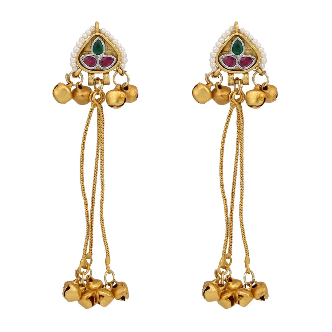 Celebrate tradition with these charming gold-plated earrings inspired by temple jewelry. The top showcases a triangular floral motif embellished with red stones and bordered by a delicate row of pearls. Dangling below are playful ghungroo bells and slender gold-tone chains ending in trios of additional bells, adding beautiful movement and a classic festive sound. Lightweight and versatile, these earrings are perfect for pairing with sarees or ethnic ensembles, effortlessly enhancing any traditional look with their timeless appeal and vibrant details.