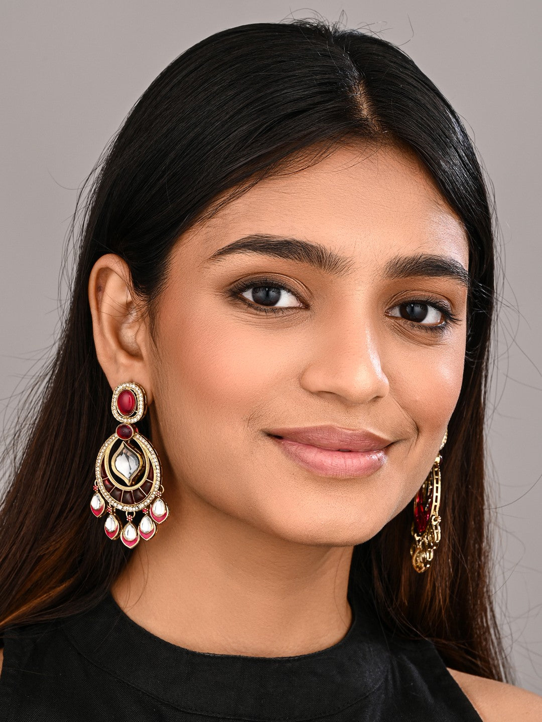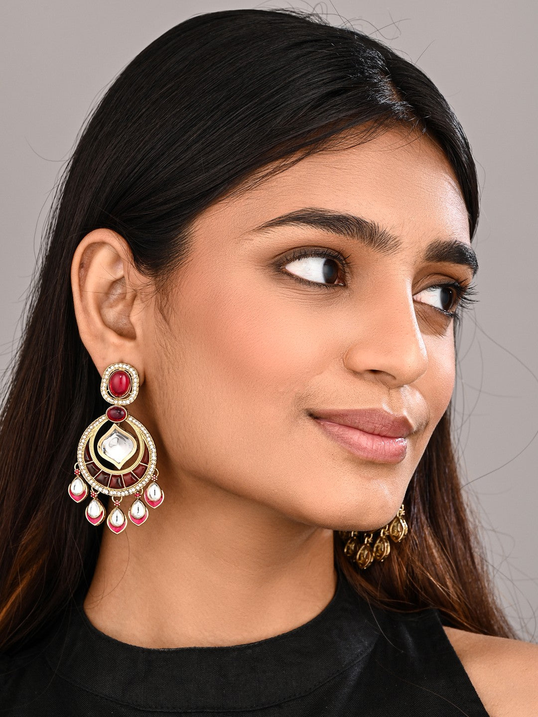 Turn heads with these gold-toned kundan chandbali earrings, featuring a layered circular motif and mirror-finish stones framed in intricate detailing. Delicate teardrop danglers add graceful movement, making them perfect for weddings, festive events, and statement evening looks when paired with sarees, lehengas, or Indo-fusion outfits.