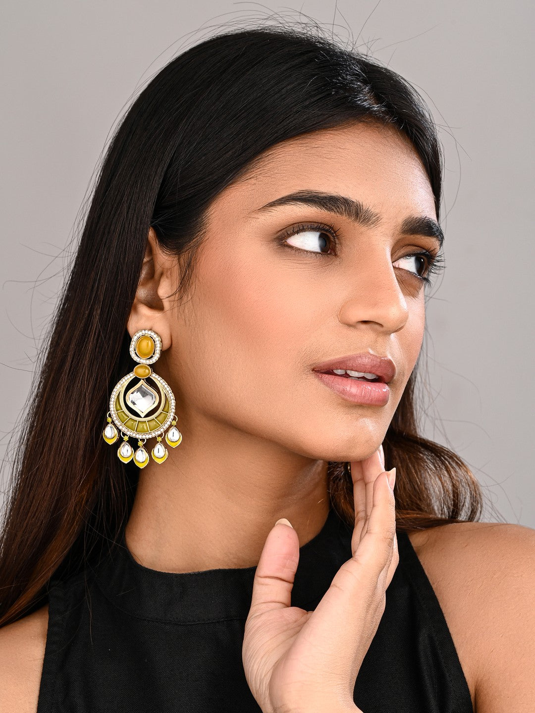 Kundan Chandbali Earrings with Teardrop Danglers- Yellow