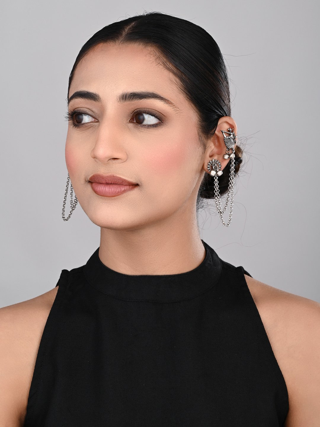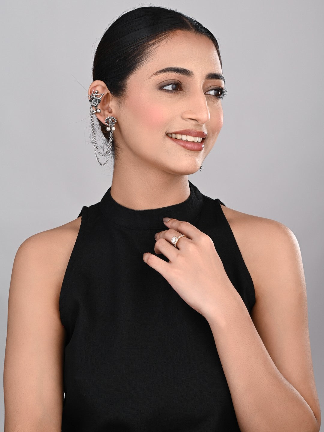 Make a fashion-forward statement with this oxidised silver ear cuff, designed to add shimmer and edge to any contemporary outfit. Effortlessly non-pierced, this ear wrap combines intricate traditional elements with a modern twist, making it a bold accessory for parties, concerts, or everyday chic looks. Lightweight, comfortable, and easy to style, it pairs perfectly with both ethnic and western ensembles for an instant touch of glamour.
