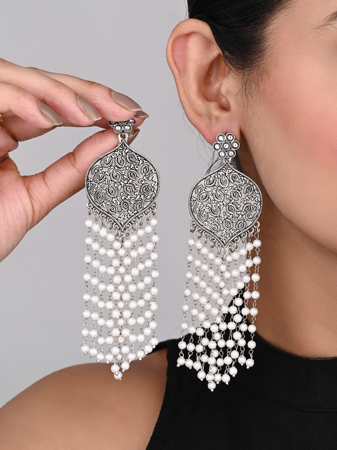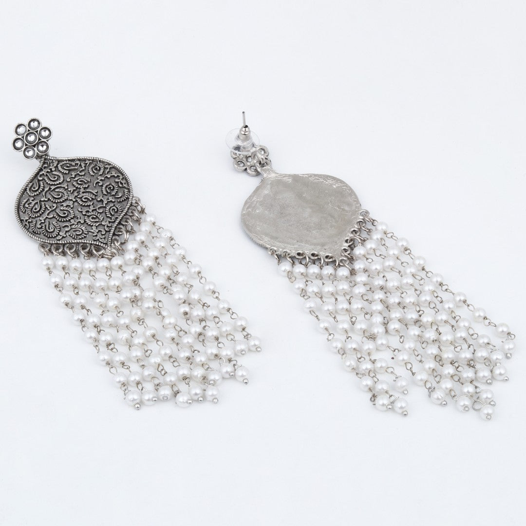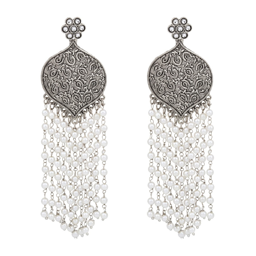 Make a bold style statement with these exquisite oxidised silver earrings, perfect for festive attire and elegant gatherings. The top showcases a floral-inspired stud followed by a large, intricately engraved drop shape that captures the essence of traditional artistry. Cascading below are multiple strands of luminous faux pearls, adding graceful movement and charm. Lightweight and easy to wear, these earrings blend vintage appeal with contemporary flair, making them a versatile addition to both ethnic and Indo-western outfits. Ideal for those who appreciate classic elegance with a modern edge.