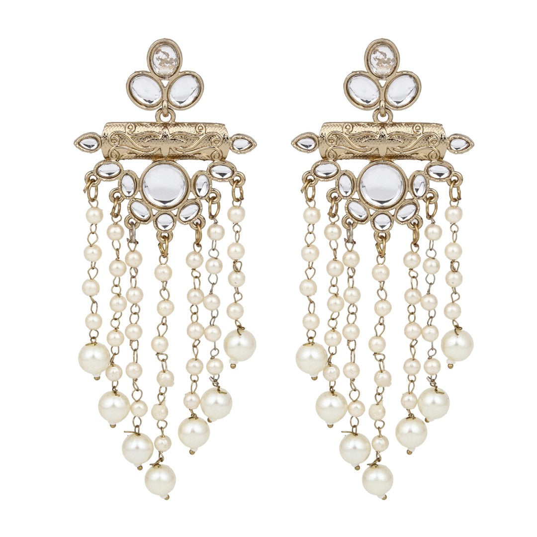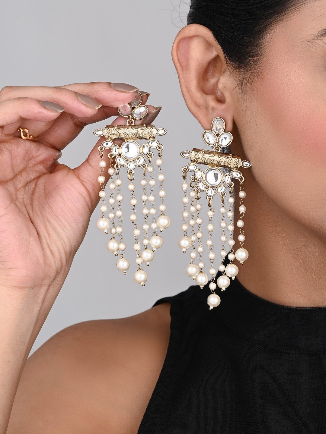 Step into elegance with these stunning kundan and pearl tassel earrings, ideal for festive celebrations, weddings, or special occasions. The design features a beautiful cluster of kundan stones at the top, followed by intricate gold-toned engravings and a dazzling circular arrangement of mirror-finish kundan. Multiple strands of delicate pearls cascade gracefully, ending in charming larger pearl drops for extra glamour. Lightweight and comfortable, these earrings perfectly pair with both traditional and fusion outfits, making them a must-have for those who adore contemporary royal style.