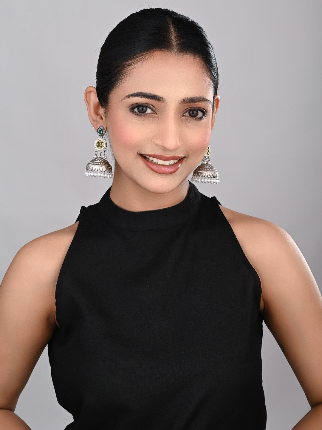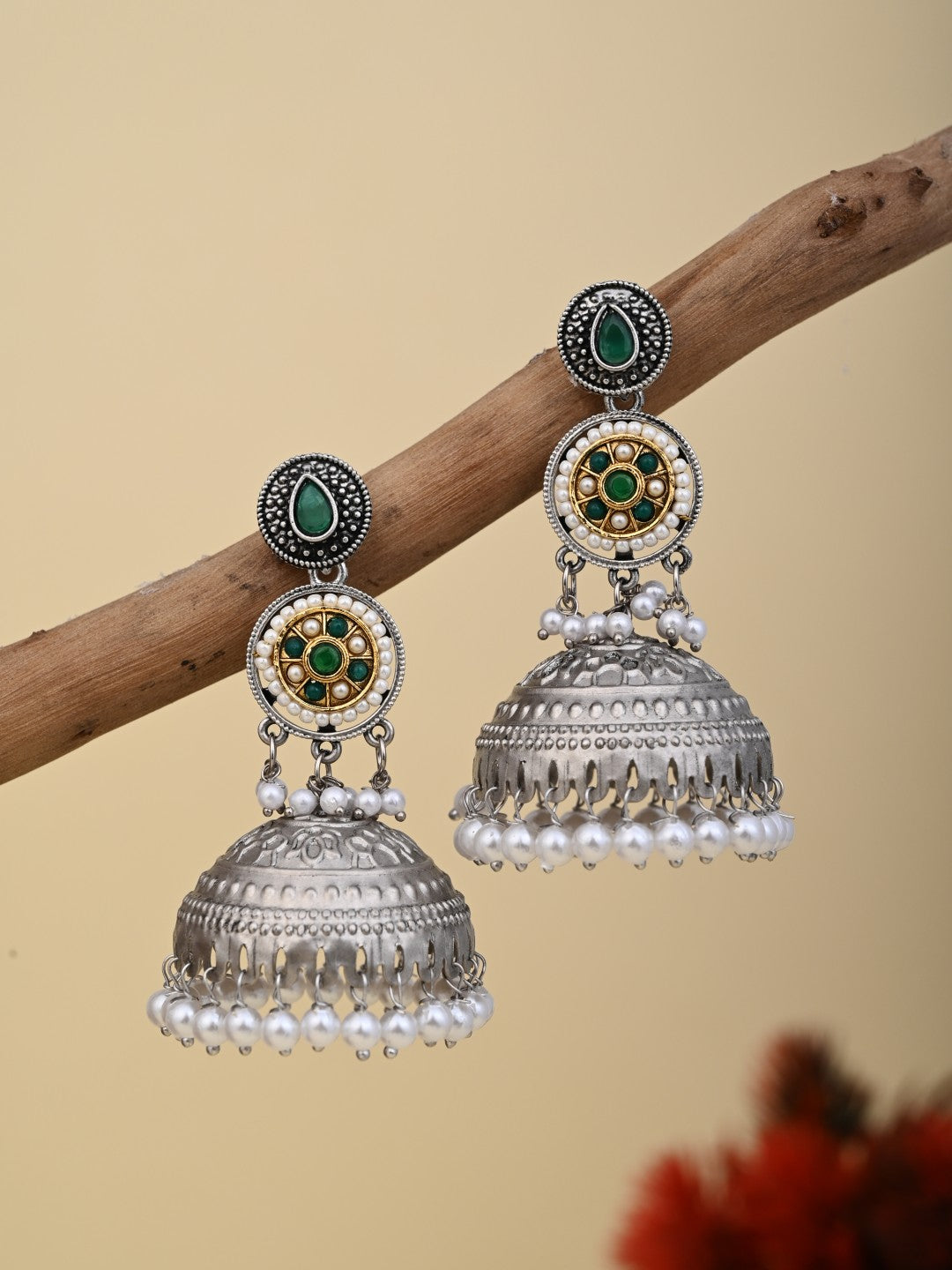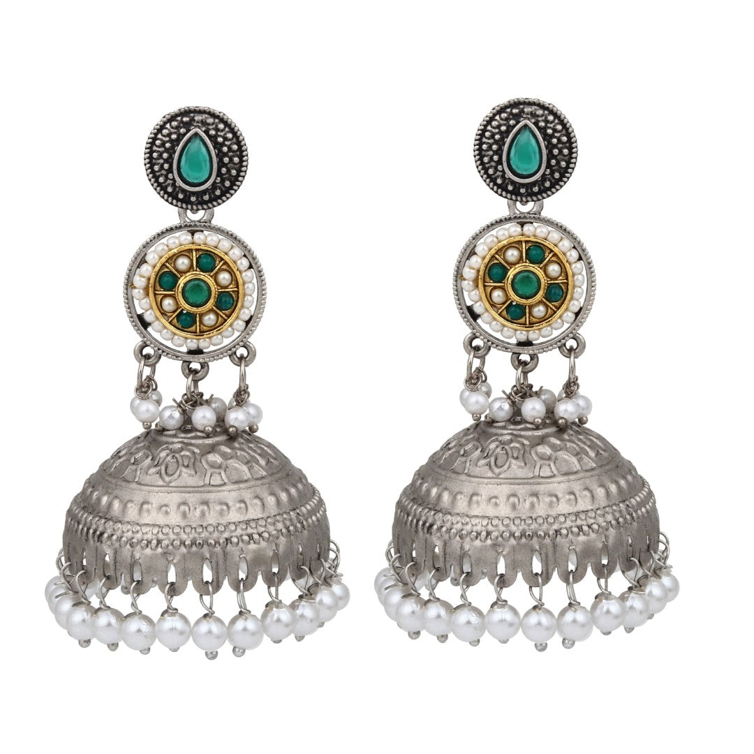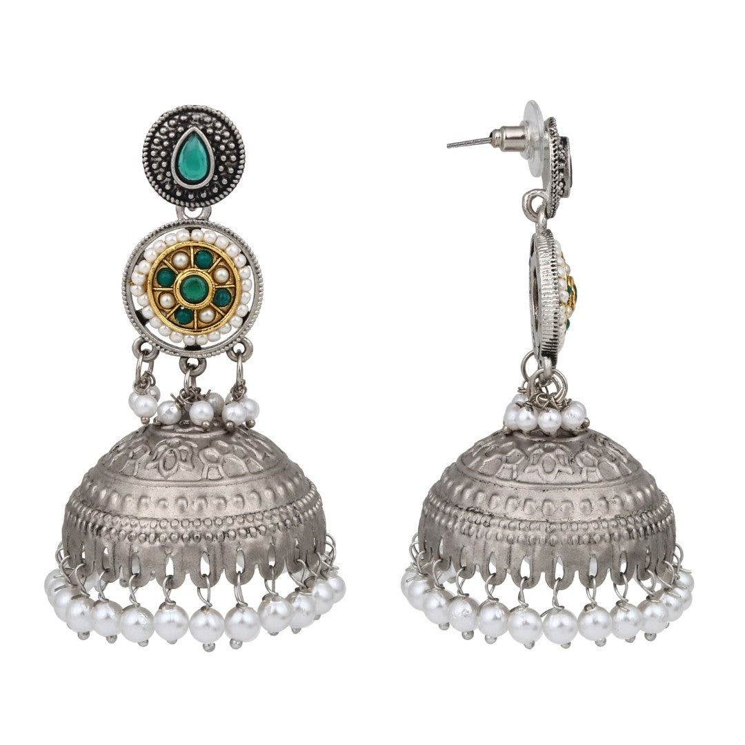 Silver plated long Jhumka - Green