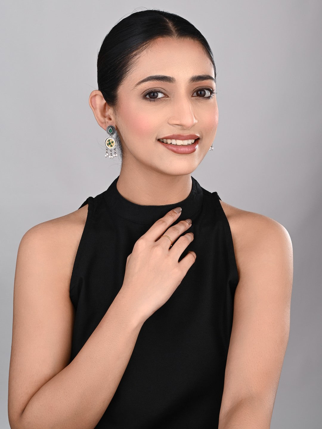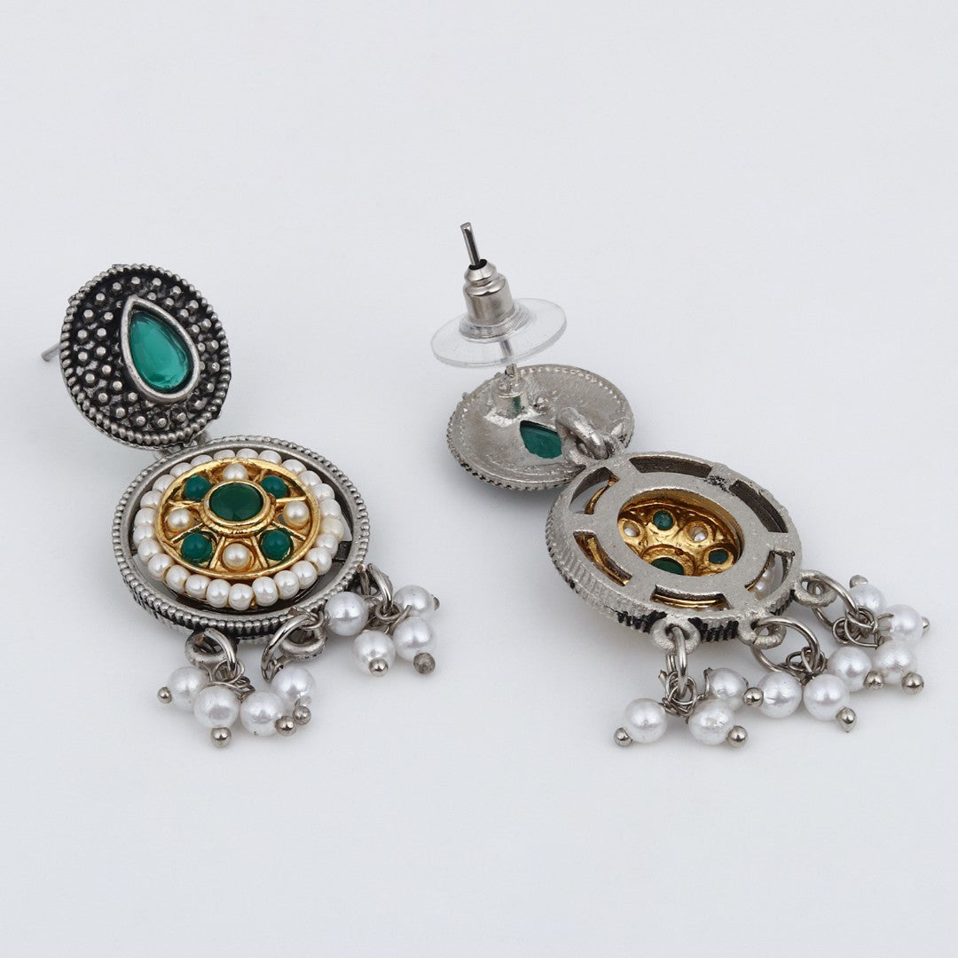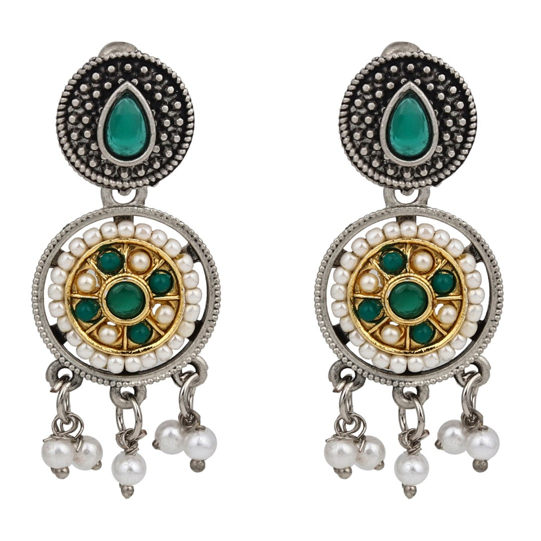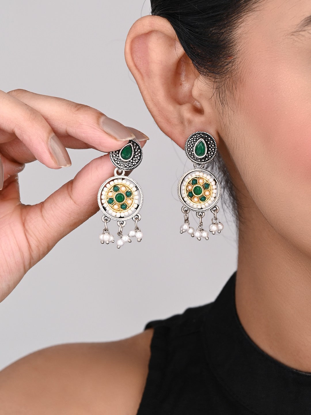 Make a statement with these elegant gold-plated circular drop earrings, crafted from premium metal alloy. Adorned with...